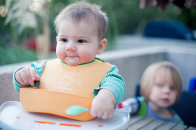 You had your first taste of rice cereal the other day. We took it outside since it was beyond nice out that day. Your brother gave your your first spoonful. (See videos below)